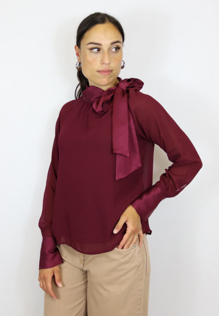 Aggiungi lista dei desideri Camicia in viscosa con fiocco Haveone CWG-P007 - BORDEAUX Camicia in viscosa con colletto a fiocco e polsino lucidi. Maniche e retro leggermente trasparenti. Veronica è alta 163 cm e indossa XS.... 85,00 €
