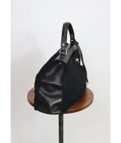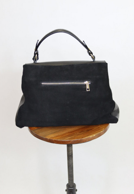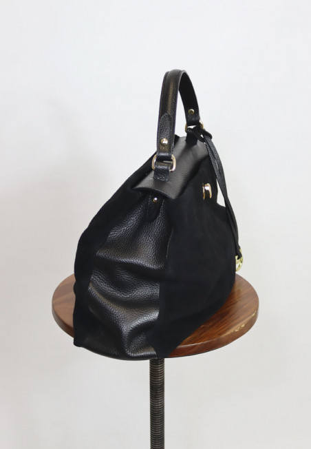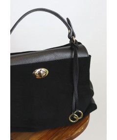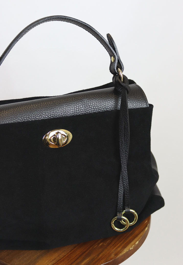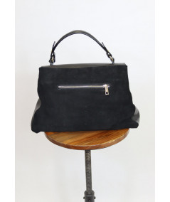 Silvia è un bauletto molto capiente realizzato in pelle scamosciata e pelle martellata. Il vano principale si apre con una fibbia metallica color oro e presenta all'interno un taschino con chiusura a zip e due tasche porta documenti. Sul lato posteriore ha un'ulteriore tasca con chiusura a clip e una taschina con chiusura a zip.