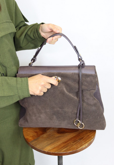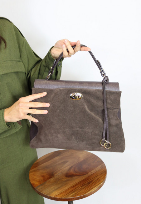 Silvia è un bauletto molto capiente realizzato in pelle scamosciata e pelle martellata. Il vano principale si apre con una fibbia metallica color oro e presenta all'interno un taschino con chiusura a zip e due tasche porta documenti. Sul lato posteriore ha un'ulteriore tasca con chiusura a clip e una taschina con chiusura a zip. Al manico una stringa di pelle con due anelli metallici dove appendere i tuoi portachiavi preferiti.