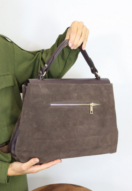 Silvia è un bauletto molto capiente realizzato in pelle scamosciata e pelle martellata. Il vano principale si apre con una fibbia metallica color oro e presenta all'interno un taschino con chiusura a zip e due tasche porta documenti. Sul lato posteriore ha un'ulteriore tasca con chiusura a clip e una taschina con chiusura a zip.