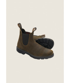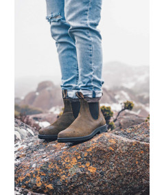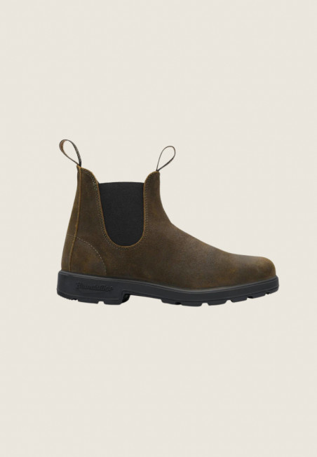 Gli stivaletti modello Blundstone #1615 sono realizzati con tomaia liscia in pelle scamosciata resistente all'acqua, in un caldo e fashion colore verde oliva scuro.
