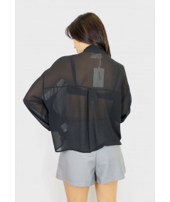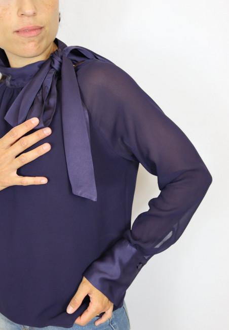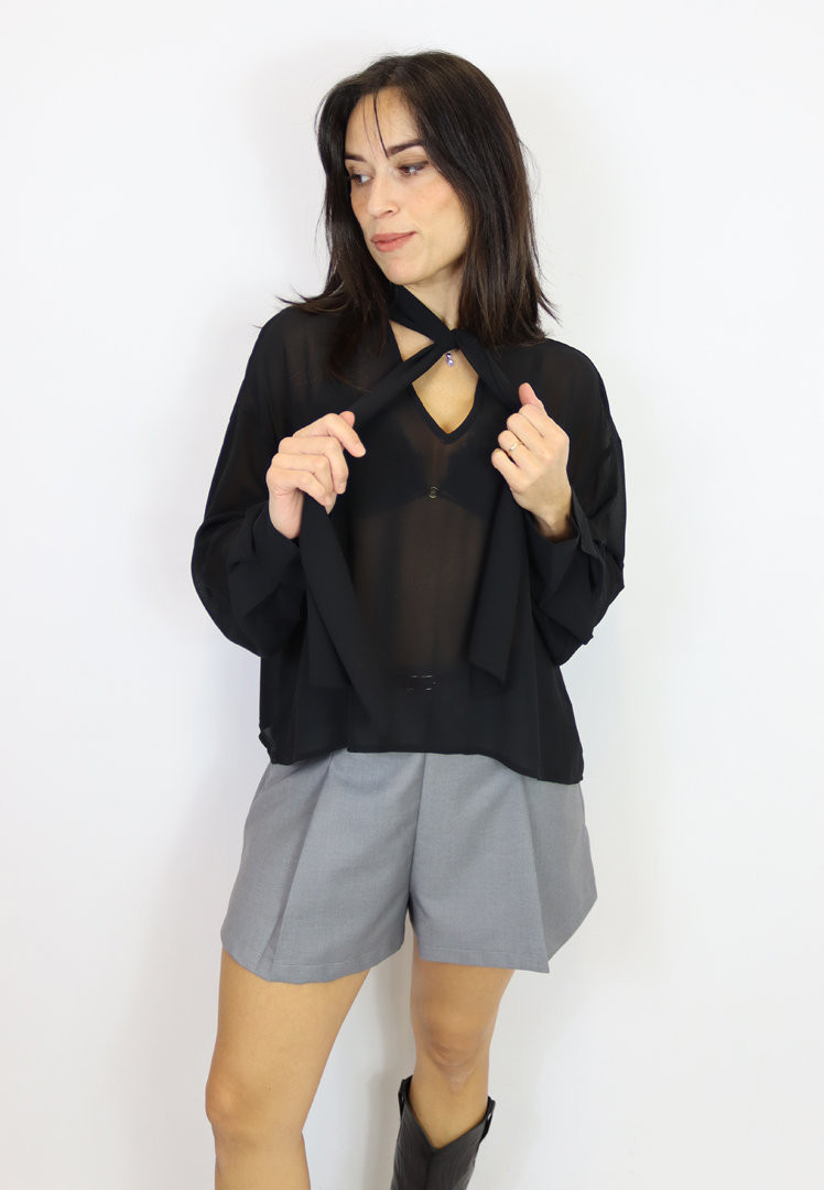 Camicia con fiocco al collo e polsino. Leggermente trasparente.