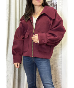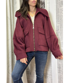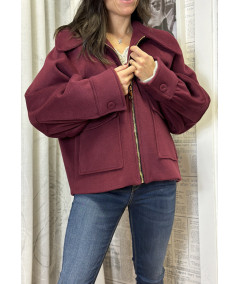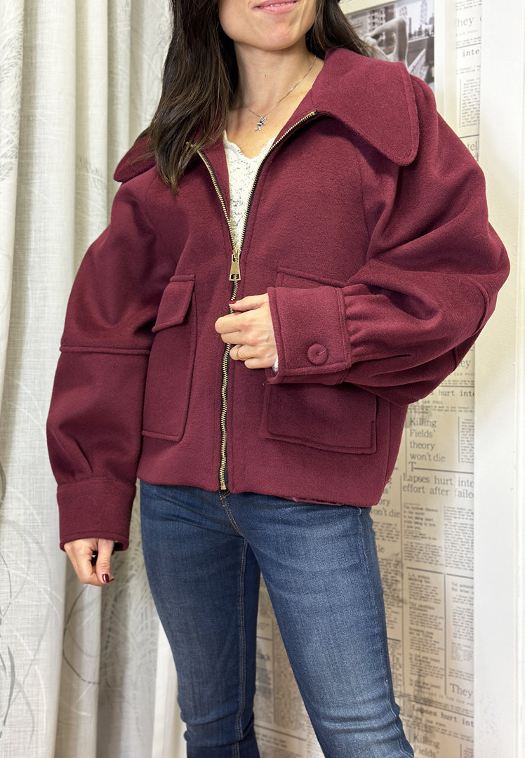 Cappotto corto modello bomber con bavero e maxi tasche applicate sul davanti. Chiusura con cerniera color oro. Manica a palloncino.