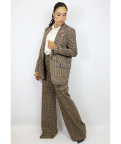 Giacca modello monopetto con stampa a quadri e spilla decorativa sul rever. Chiusura a un bottone e tasche frontali a patta. Modello dritto piuttosto lungo.