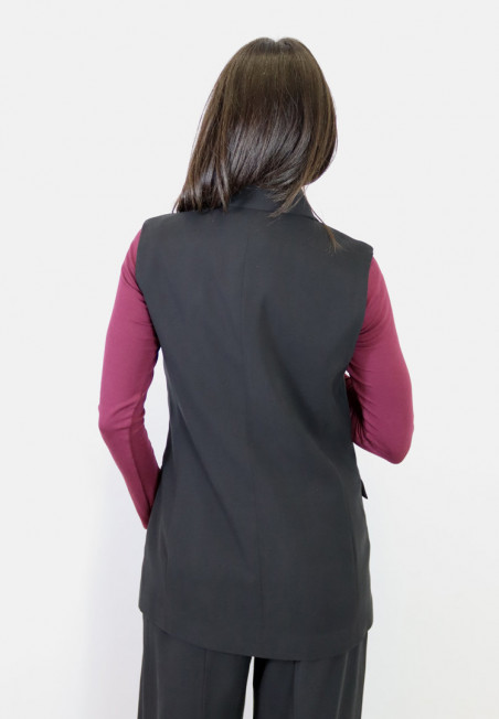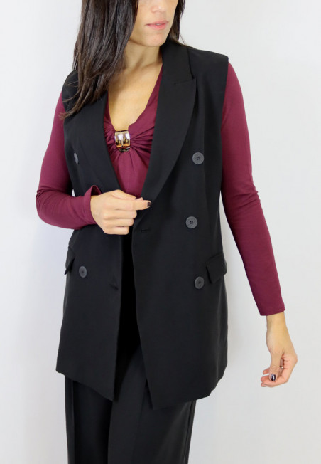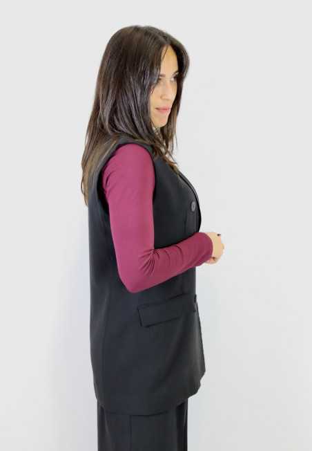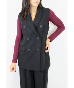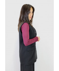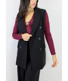 Gilet lungo modello doppiopetto realizzato in morbida viscosa. Scollo con classico rever, chiusura con bottoni e tasche a pattina frontali. Puoi abbinarlo al suo pantalone palazzo o sigaretta per creare il coordinato più richiesto della stagione. Tre splendide varianti colore tra cui scegliere!