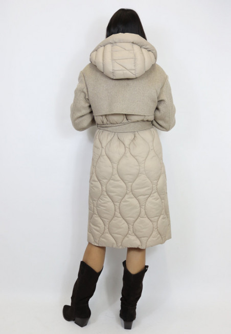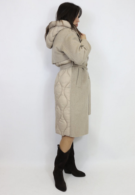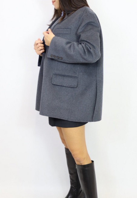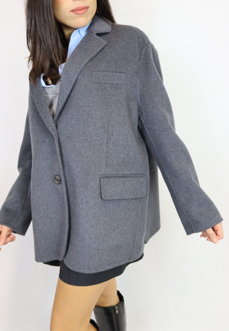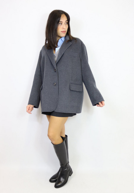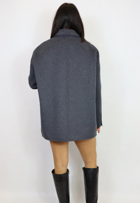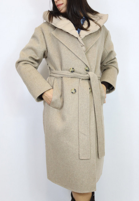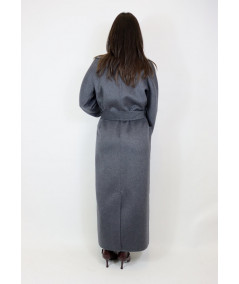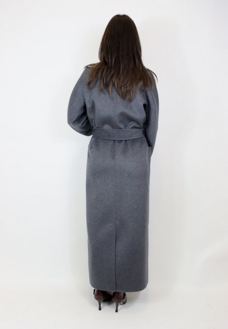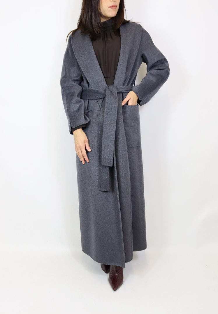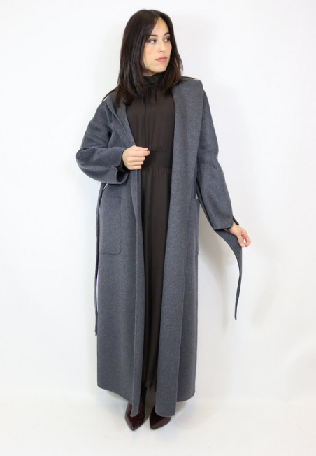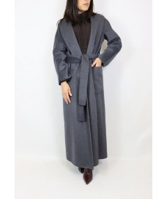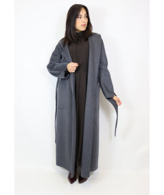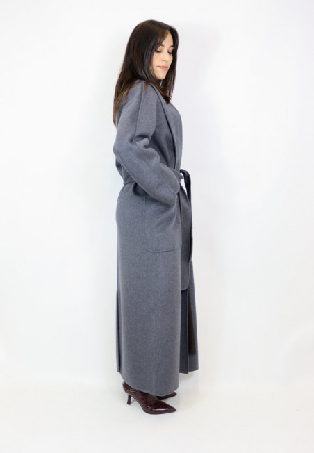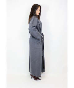 Cappotto hand made misto lana modello senza bottoni con cintura. Maxi tasche applicate sulla parte anteriore.