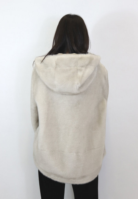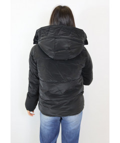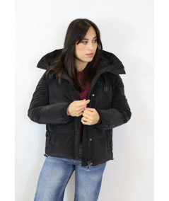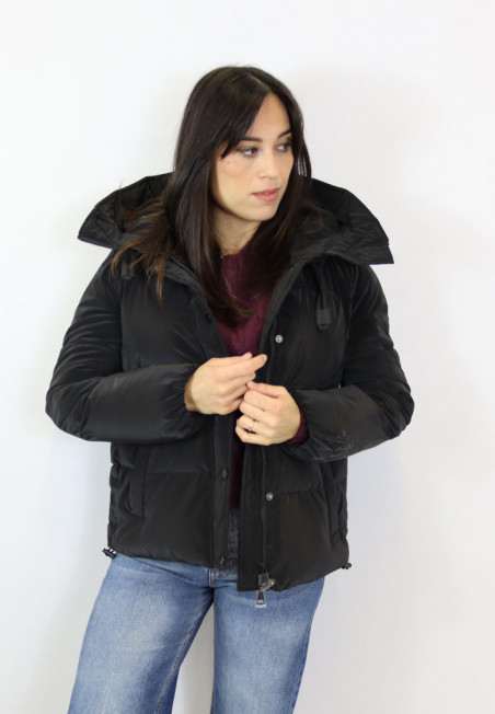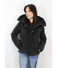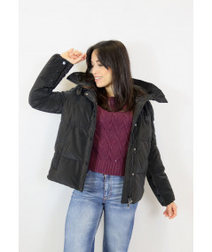 Piumino corto con tasche a filetto e cappuccio. Si chiude con cerniera a doppio cursore. presenta una fila di bottoncini a clip sul davanti e sulle maniche. Modello dal taglio dritto con cordino elastico e fermacorda sul fondo per stringerlo al bisogno.