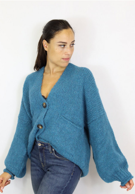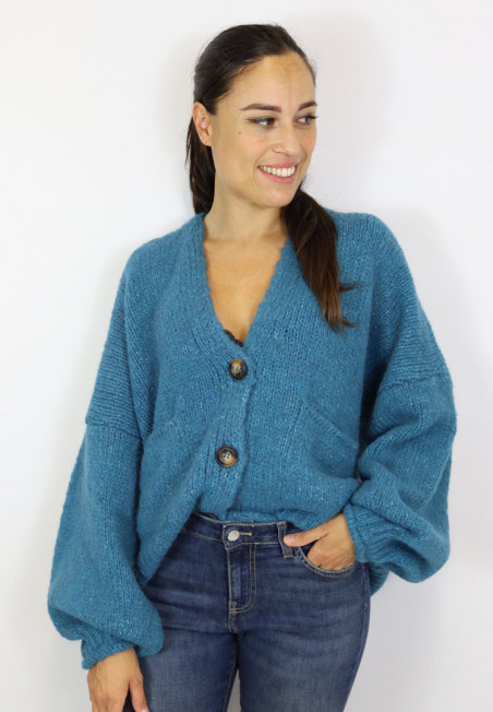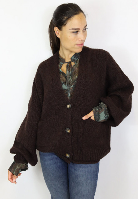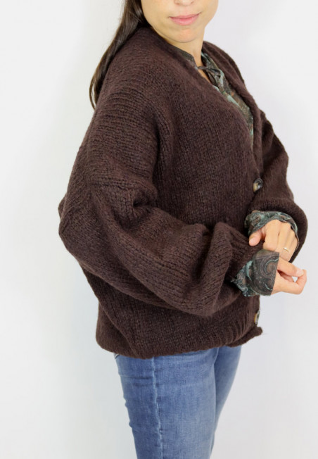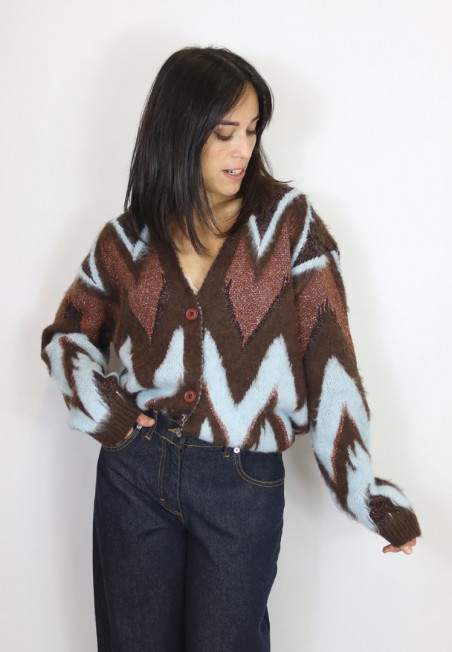 Cardigan misto lana dal taglio oversize con manica scesa e polsino. Chiusura classica con bottoni. Presenta una stampa dai toni del lime e del bordeaux di gran tendenza questo autunno inverno. Stile college. Vestibilità morbida.