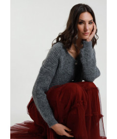 Cardigan dal taglio crop di Susy Mix. Il cardigan presenta tre bottoni gioiello e lo svollo a V.