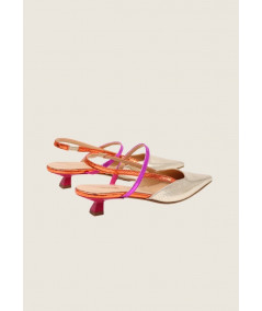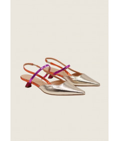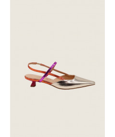 Dècollète slinback in similpelle effetto croco con punta stretta, tallone aperto e allacciatura dietro la caviglia facilitata grazie all'elastico. Un cinturino corre sul collo del piede a dare stabilità. Il tacco a rochetto misura 3,5 cm. Meraviglioso gioco a tre colori che rende questa slingback protagonista di ogni tuo look, anche sotto ad un semplice paio di jeans!
