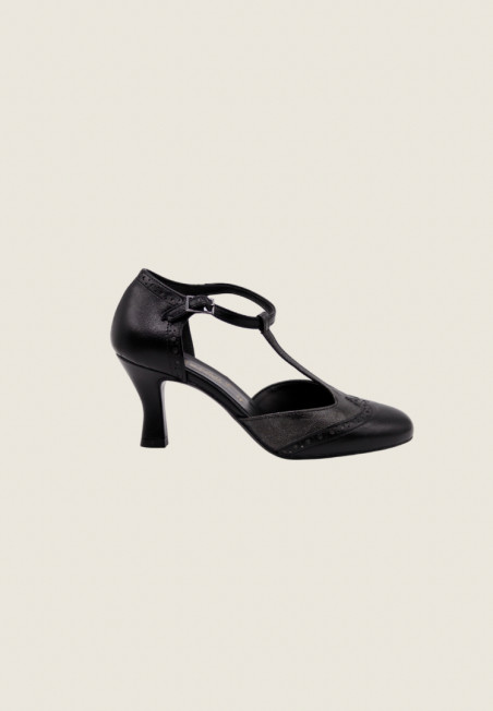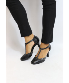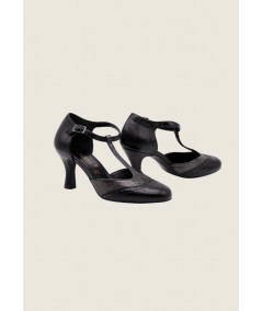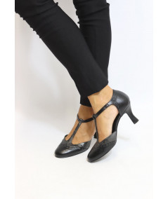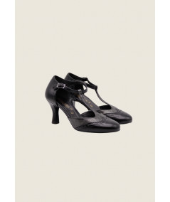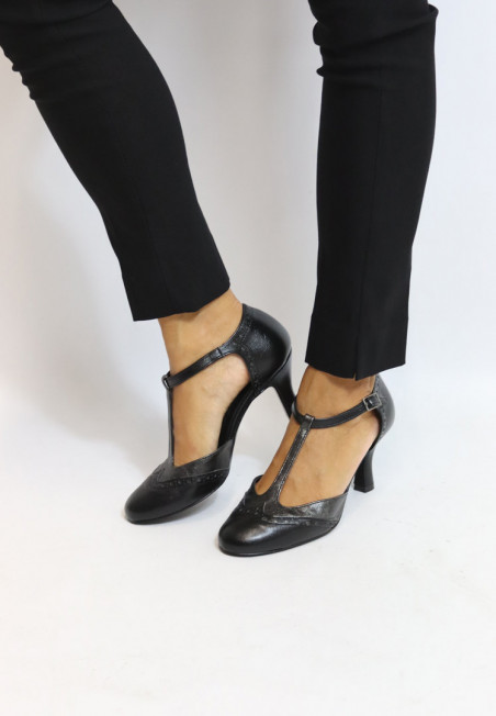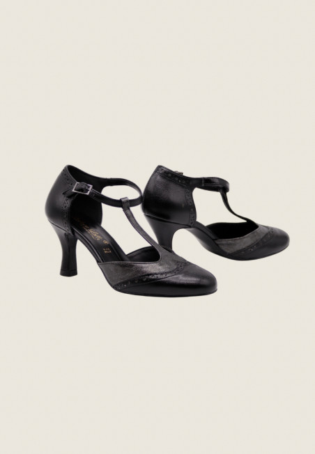 Décolleté bicolor modello Mary Jane con T-Bar, impunture a coda di rondine e cinturino regolabile sul collo del piede. E' realizzata in similpelle di alta qualità con inserti laminati canna di fucile o bronzo. Il tacco a rocchetto misura 7 cm.