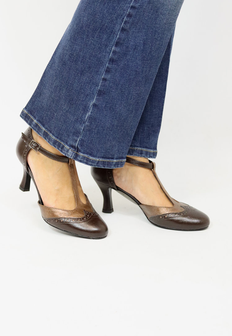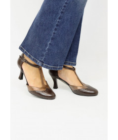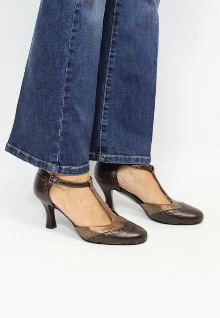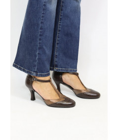 Décolleté bicolor modello Mary Jane con T-Bar, impunture a coda di rondine e cinturino regolabile sul collo del piede. E' realizzata in similpelle di alta qualità con inserti laminati canna di fucile o bronzo. Il tacco a rocchetto misura 7 cm.