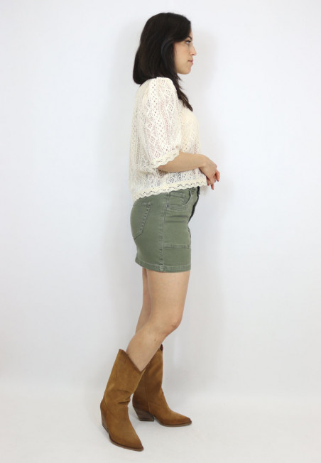 Minigonna in cotone elasticizzato con doppio bottone, zip e tasche frontali.