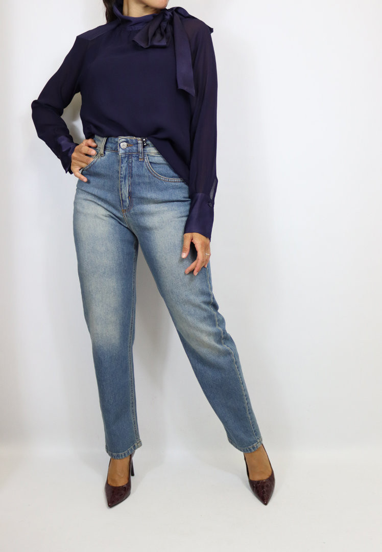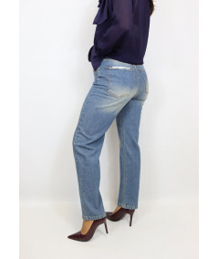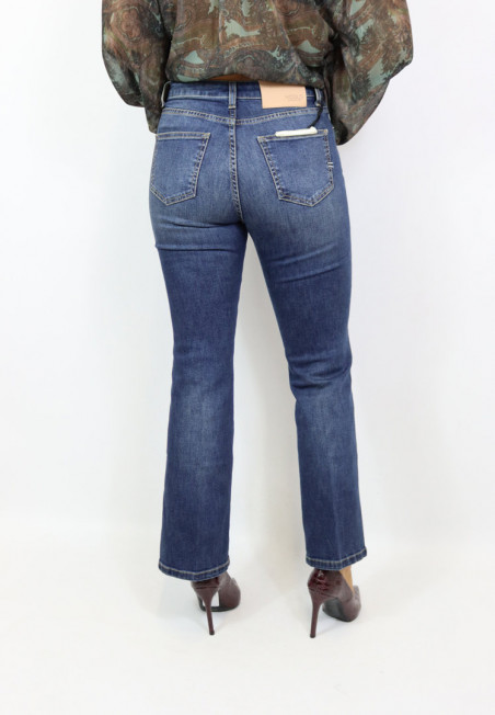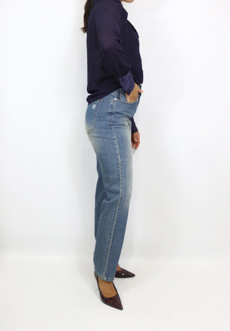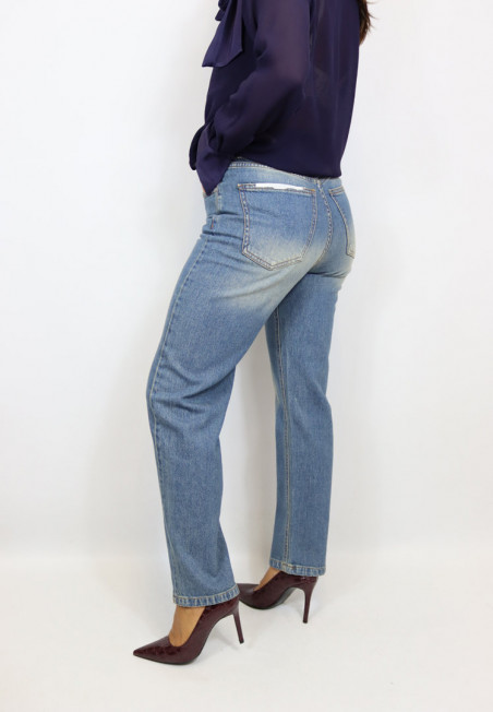 Jeans dal lavaggio medio con schiariture. Modello straight leg a gamba dritta cropped fit. Modello 5 tasche a vita alta con passanti in vita e chiusura con zip e bottone.