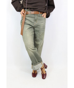 Jeans modello straight leg ampio con risvolta e cintura in dotazione. Lavaggio colorato militare o cipolla con schiariture, chiusura frontale con zip e bottone. Modello cinque tasche dalla vita medio alta.