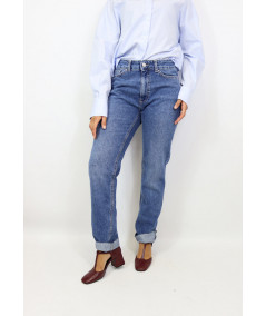 Jeans modello straight leg. Lavaggio blu con schiariture, chiusura frontale con zip e bottone. Modello cinque tasche dalla vita medio alta.