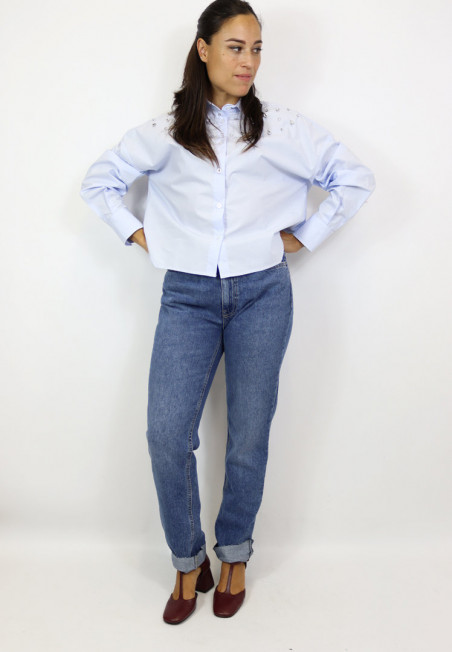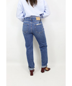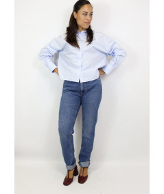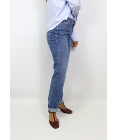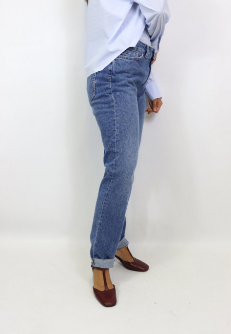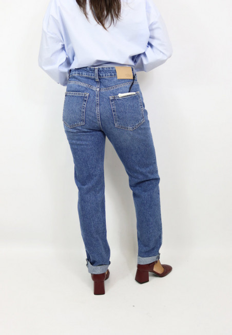Jeans modello straight leg. Lavaggio blu con schiariture, chiusura frontale con zip e bottone. Modello cinque tasche dalla vita medio alta.