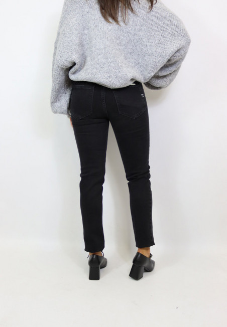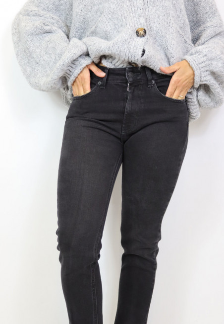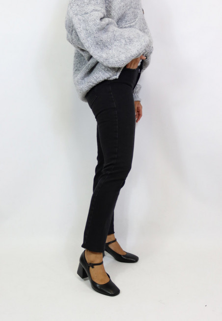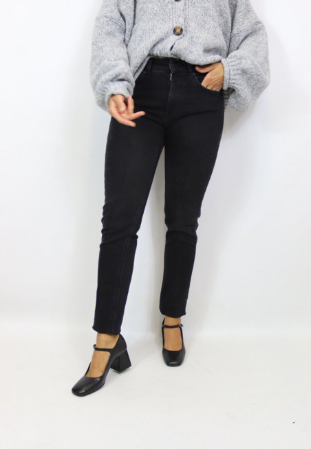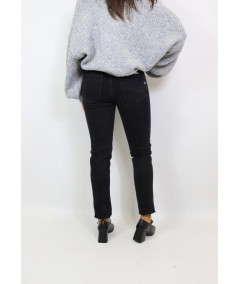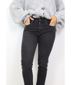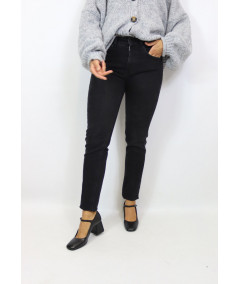Jeans modello skinny elasticizzato. Lavaggio nero, chiusura frontale con zip e bottone. Modello cinque tasche dalla vita alta.
