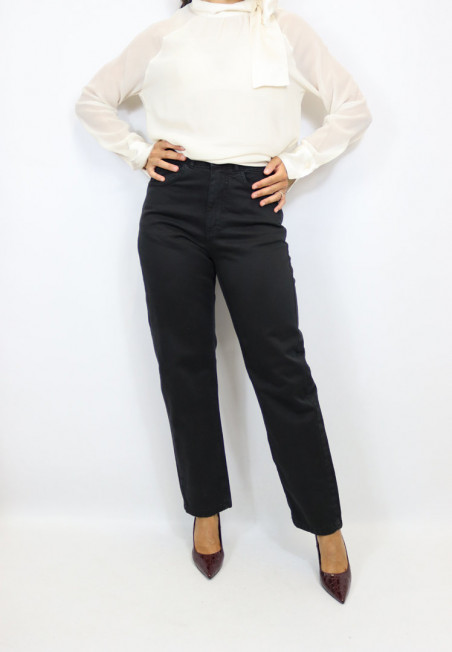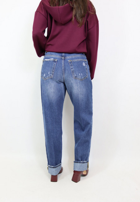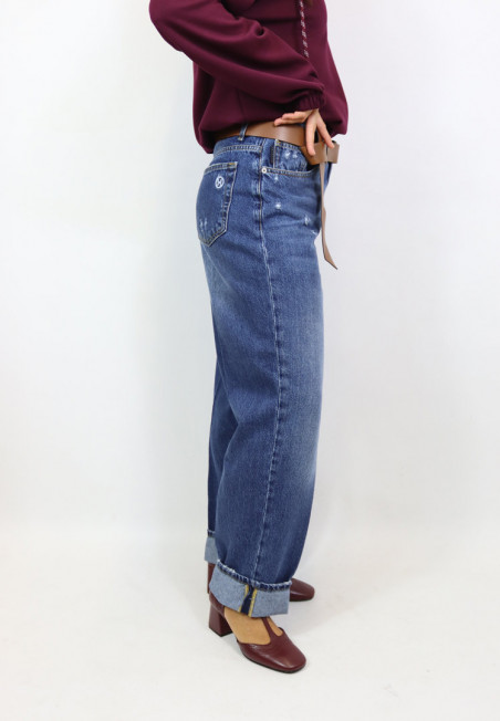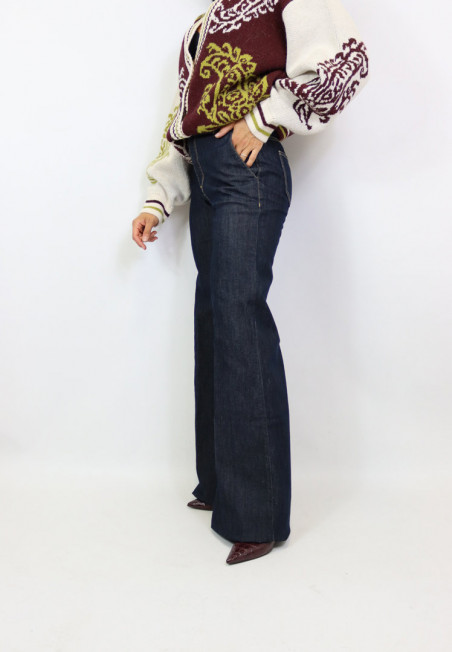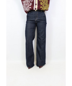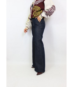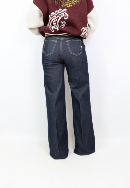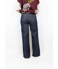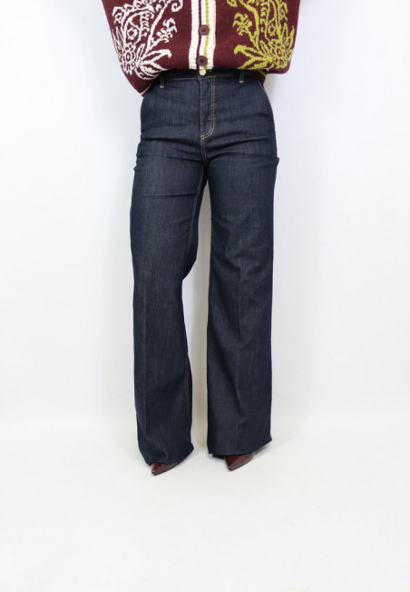 Jeans modello palazzo dal lavaggio scuro con chiusura frontale con zip e bottone. Modello con tasca americana e vita medio alta.