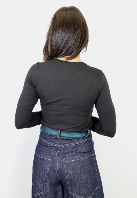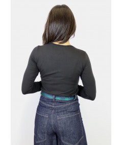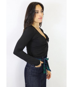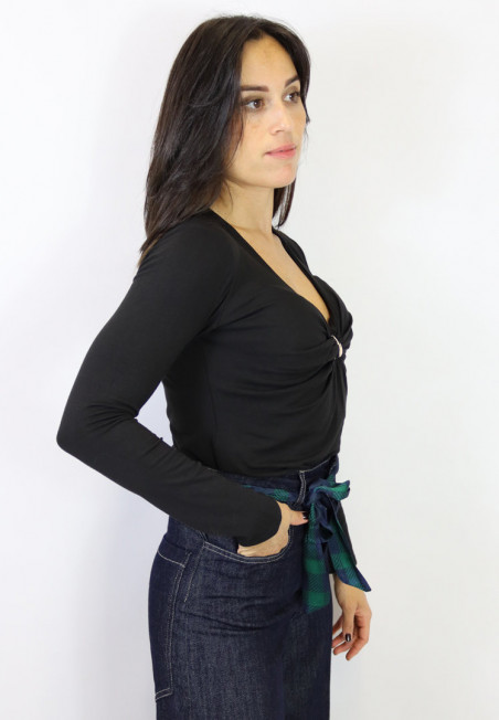 Maglia elasticizzata con scollo a V, arricciatura e accessorio oro al seno. Perfetta come sottogiacca.