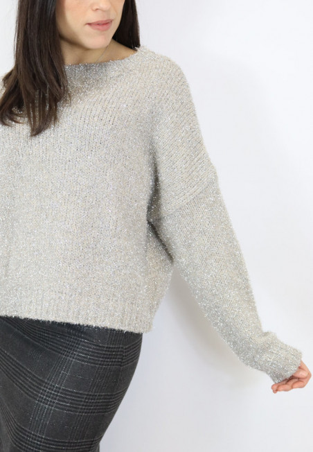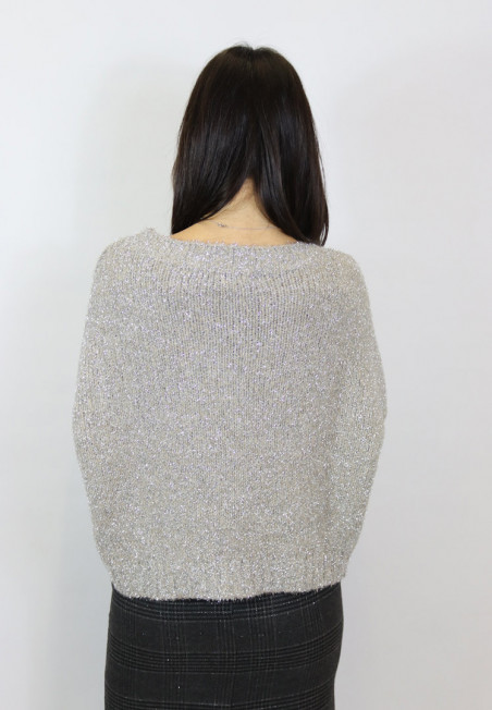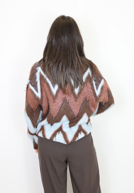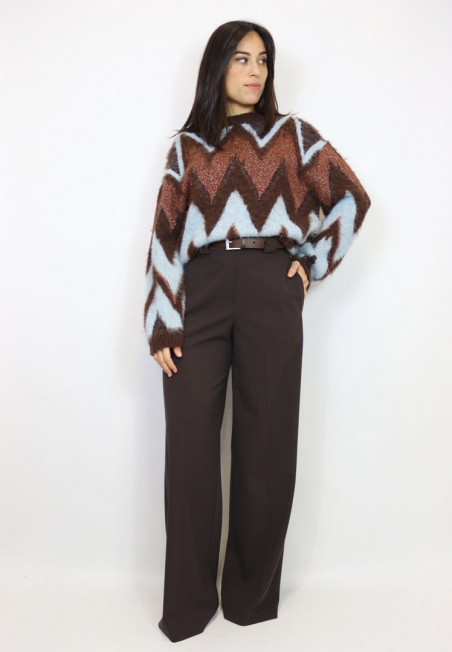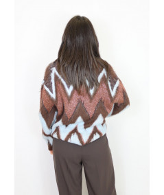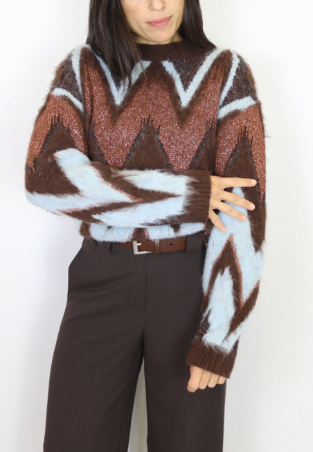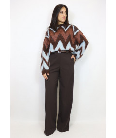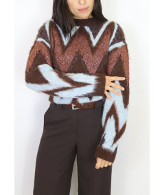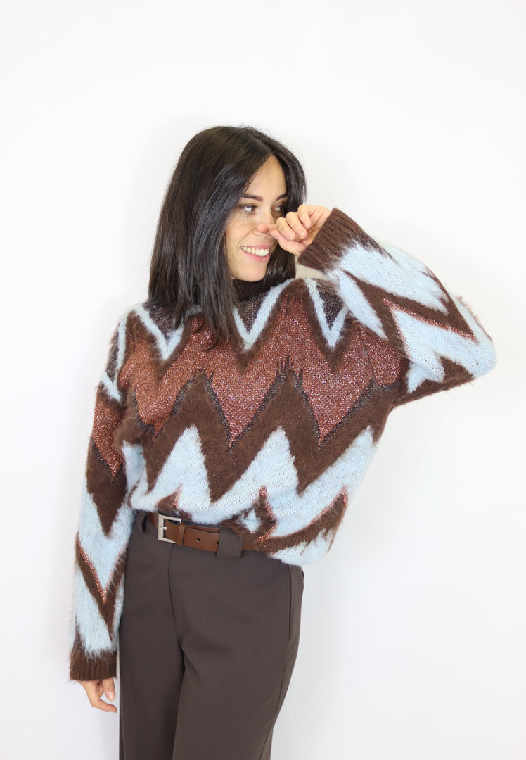 Maglia con scollo a barchetta e stampa zig zag con inserti lurex color bronzo. Vestibilità over. Manica scesa. Bellissima da indossare con un pantalone palazzo dal taglio sartoriale.