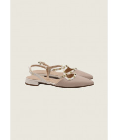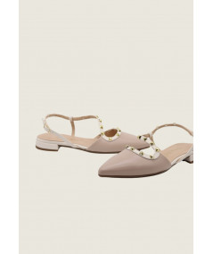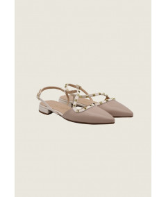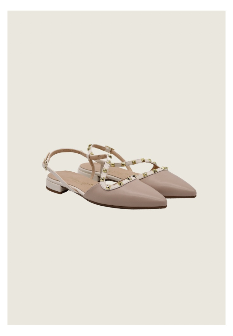 Ballerina realizzata in ecopelle di alta qualità con punta stretta, allacciatura dietro al tallone e aperture laterali. Il tacco fasciato misura 2 cm. E’ caratterizzata da una fascetta che corre lungo il collo del piede impreziosita da mircro borchie piramidali color oro.