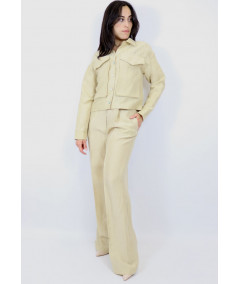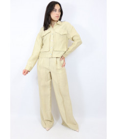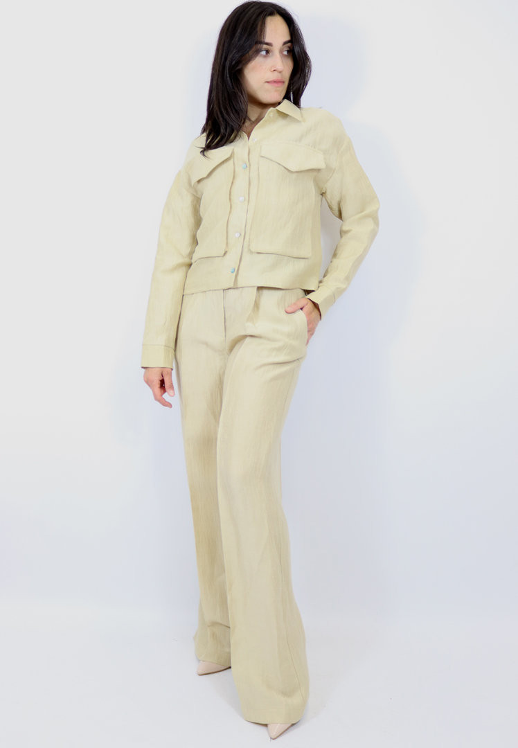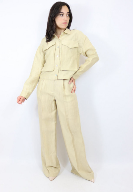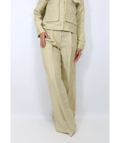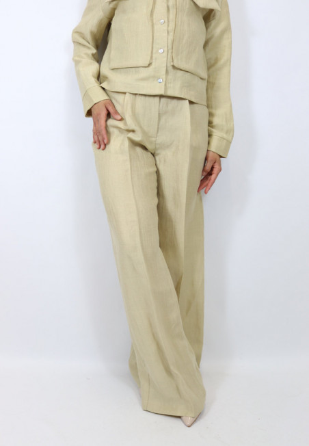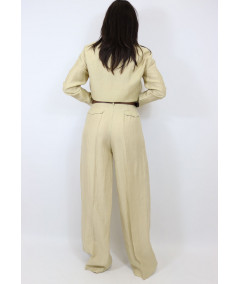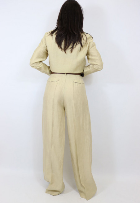 Pantalone in misto lino effetto stropicciato con pence e vita alta. Modello palazzo con cintura in dotazione. Chiusura classica con zip e bottone, tasche laterali e sul retro.