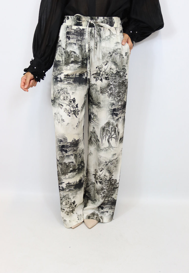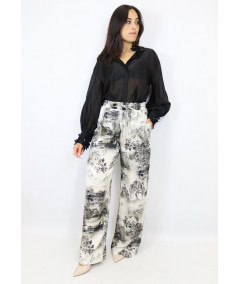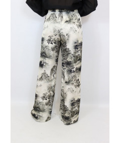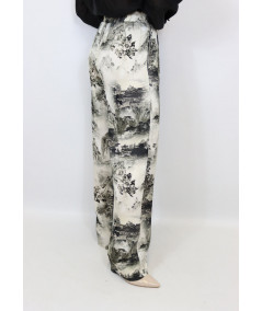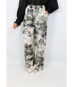 Pantalone palazzo in viscosa con stampa stile japan. Il pantalone ha un elastico e la coulisse in vita.