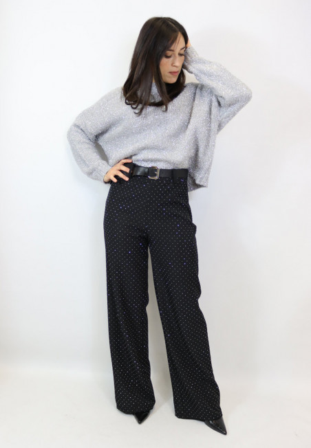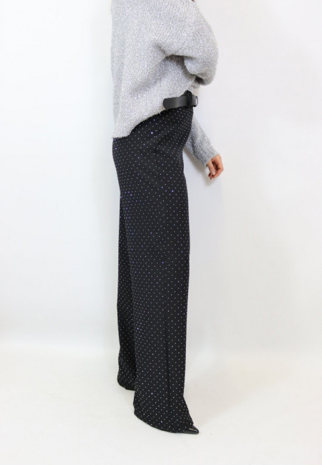 Pantalone palazzo a vita alta con fusciacca in vita. Maxi passanti, chiusura invisibile con gancino e piega sul frontale con spacchetto sul fondo. Tasche laterali.