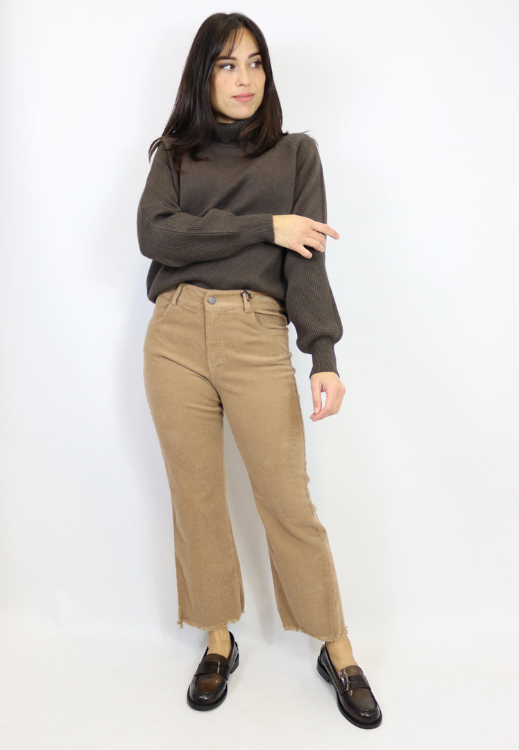 Pantalone millerighe effetto velluto. Modello flare cropped fit con chiusura frontale con zip e bottone. Modello 5 tasche e vita medio alta.