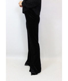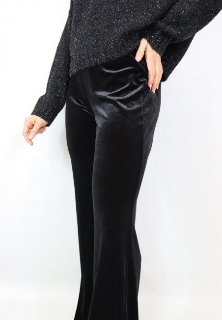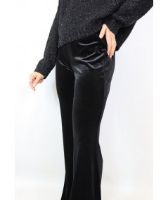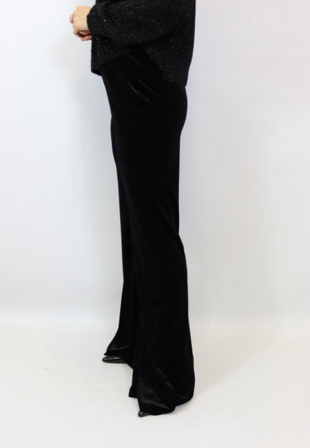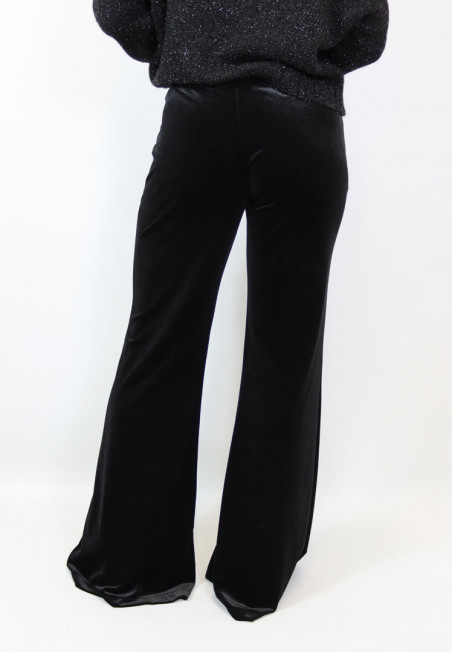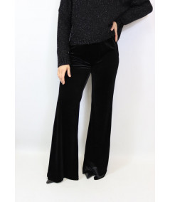 Pantaloni flare in velluto con elastico in vita. Modello senza tasche. Perfetti per le tue serate importanti, sono ideali da sfoggiare durante le festività!