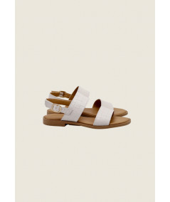 Sandalo flat realizzato in pelle con doppia fascia sul davanti. Si chiude dietro alla caviglia con fibbia regolabile. La pelle ha una stampa a intreccio.