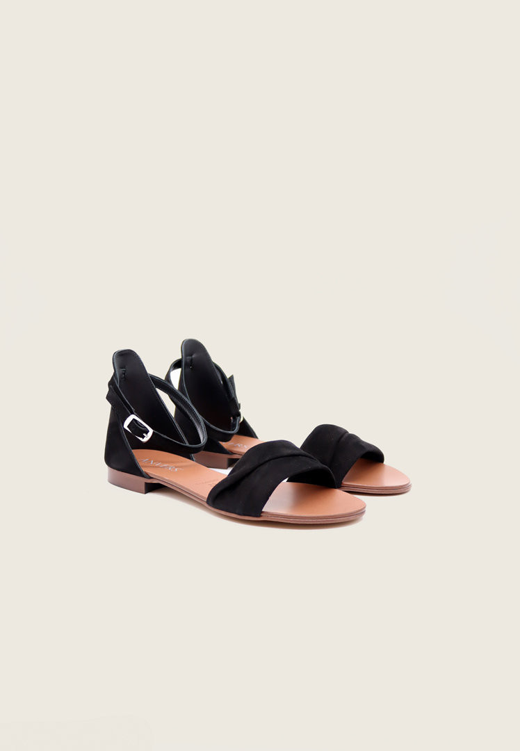 Sandalo flat realizzato in morbida pelle scamosciata con tallone chiuso, fascia larga e cinturino intorno alla caviglia. Il modello si chiude grazie ad una piccola fibbia. Tacco di 1 cm. È il sandalo da portare tutto il giorno, tutti i giorni: grazie alla sua linea semplice e pulita si abbinerà ad ogni tuo look.