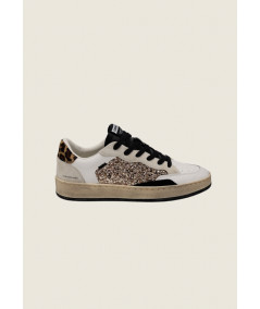 Sneaker realizzata con materiali di alta qualità Made in Italy. Il modello Gold Animalier ha la tomaia in pelle bianca con glitter oro e dettagli in suede nero, il talloncino in cavallino leopardato e il tallone in suede crema. Il modello Baddie on the block ha la tomaia in pelle bianca con suede bianco, dettagli in glitter argento e talloncino in glitter argento, mentre il tallone è in cracklé bianco con logo CRIME