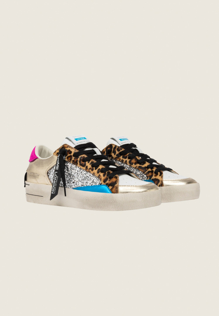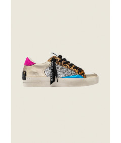 La Platinum Glam ha la tomaia in pelle bianca con profili laminati e glitter platino, tallone in pelle bianca e dettagli in suede grigio chiaro. La Leopard Shine ha la tomaia in lamina platino con glitter argento e cavallino leopardato, dettagli in lamina turchese e talloncino in cavallino fucsia. La bronzed Up ha la tomaia in pelle bianca con suede beige,