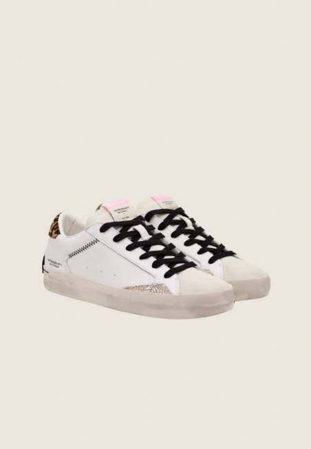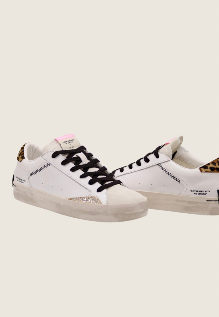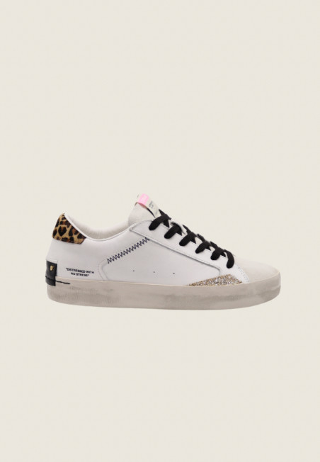Sneaker realizzata con materiali di alta qualità Made in Italy. Il modello Savage White presenta la tomaia in pelle bianca con tallone in cavallino animalier e dettagli in glitter platino. Effetto distressed su tomaia e suola. Linguetta in suede beige con label logata in tessuto