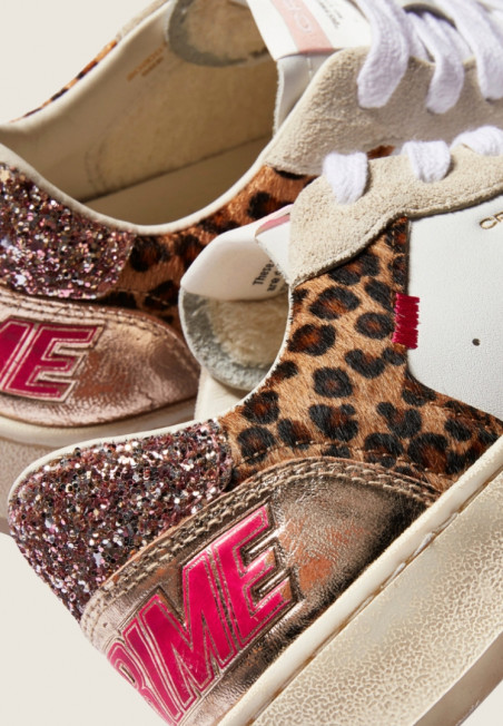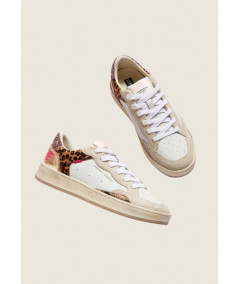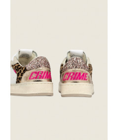 Tallone in suede bianco con logo CRIME. Lacci bianchi in cotone. Il modello PINK CHEETAH ha la tomaia in pelle bianca con suede crema e cavallino leopardato, dettagli in lamina cracklé platino. Talloncino in glitter rosa antico e tallone in lamina cracklé platino con logo CRIME. Doppio laccio bianco e nero.