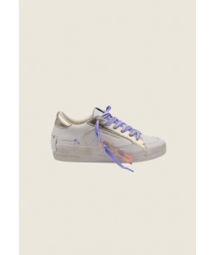 Lacci lavanda, lurex lavanda e off white con charm. La variante ALWAYS SHINING ha la tomaia in cracklé bianco, dettagli in suede bianco e talloncino in glitter argento. Doppio laccio off white e in strass argentoFodera in pelle e tessuto