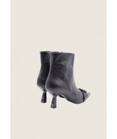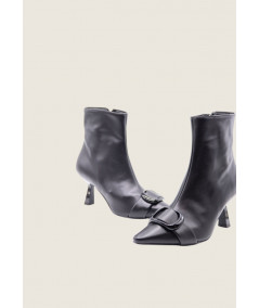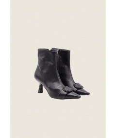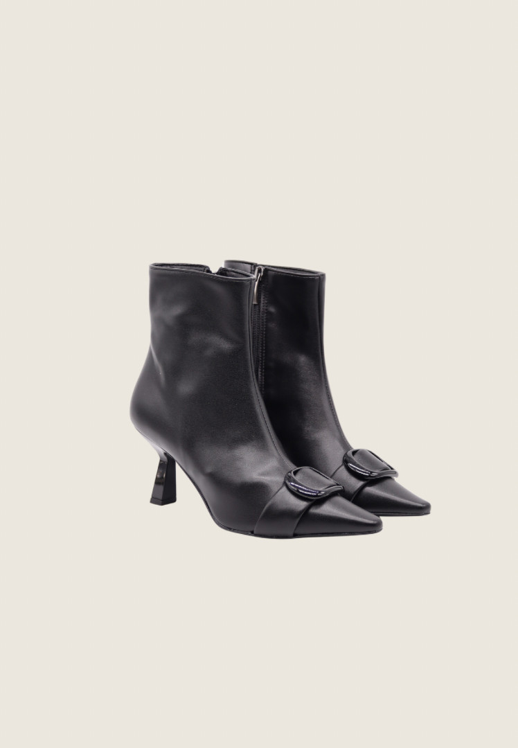 Stivaletto relizzato in similpelle con punta stretta, accessorio di carattere e chiusura a zip sul lato interno. Il tacco è in vernice, a rocchetto e misura 7,5 cm.