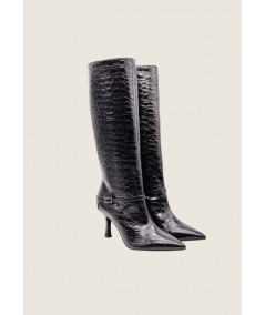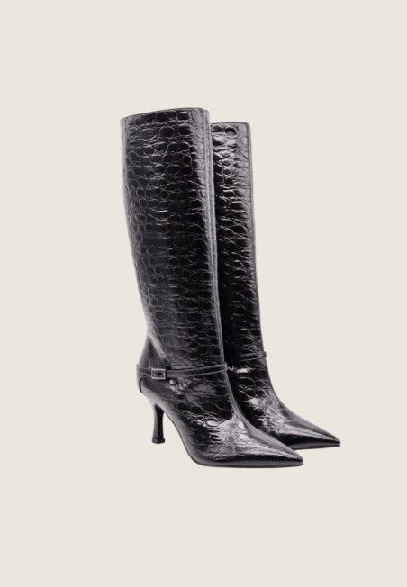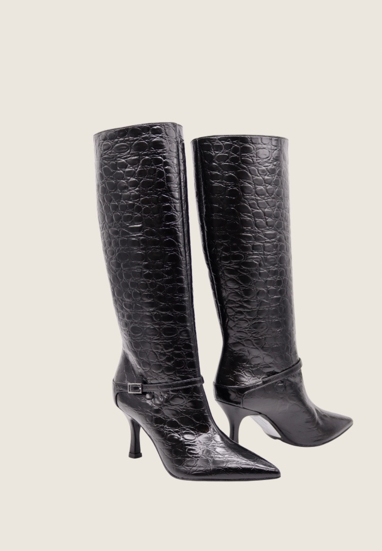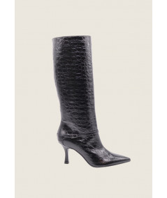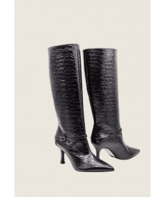 Stivale relizzato in similpelle stampa cocco con punta stretta e cinturino sul collo del piede. Il tacco è a rocchetto e misura 8 cm. Darà carattere a qualunque tuo look.