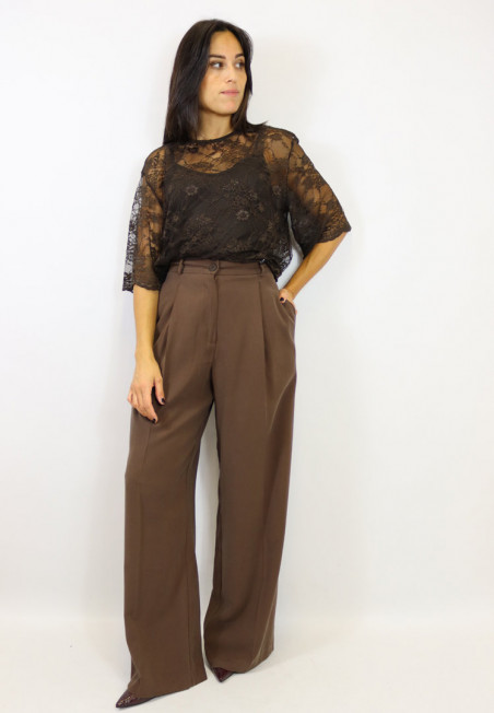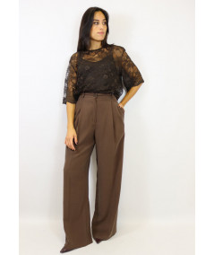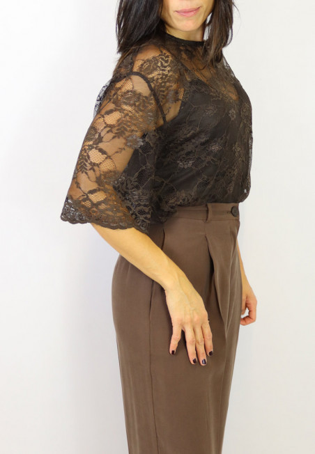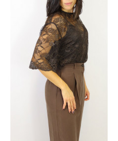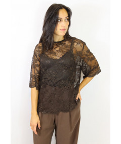 Blusa girocollo in pizzo con top a spallino fine in tinta. Chiusura dietro al collo con bottoncino. Bellissima per le tue cerimonie autunnali.