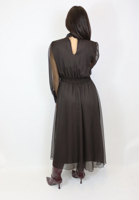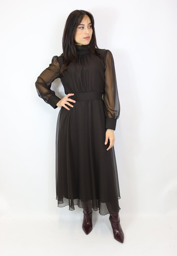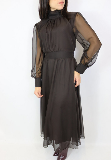 Abito lungo in chiffon con abbotonatura dietro al collo, balza in vita e gonna svasata. Ha la manica a palloncino trasparente e il polsino. Elastico in vita sul retro. Fodera in viscosa e strato sopra in chiffon che dà movimento. Ideale per le cerimonie autunnali e le tue serate importanti.