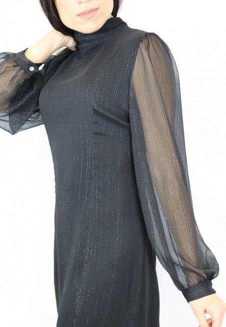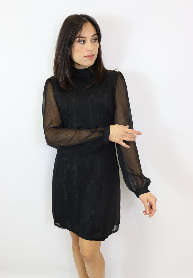 Vestito sopra al ginocchio con fiocco dietro al collo e filo di lurex. Chiusura con zip invisibile sul retro. Maniche trasparenti a palloncino. Ideale da sfoggiare durante le festività!